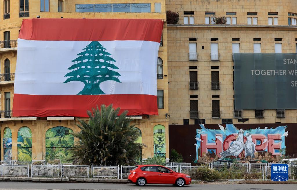 11月22日,一輛汽車駛過(guò)黎巴嫩首都貝魯特街頭懸掛的巨型國(guó)旗。