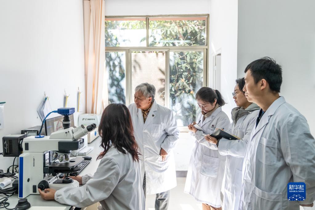 11月22日,朱兆云(左二)在云南省藥物研究所實驗室指導(dǎo)學(xué)員做研究。