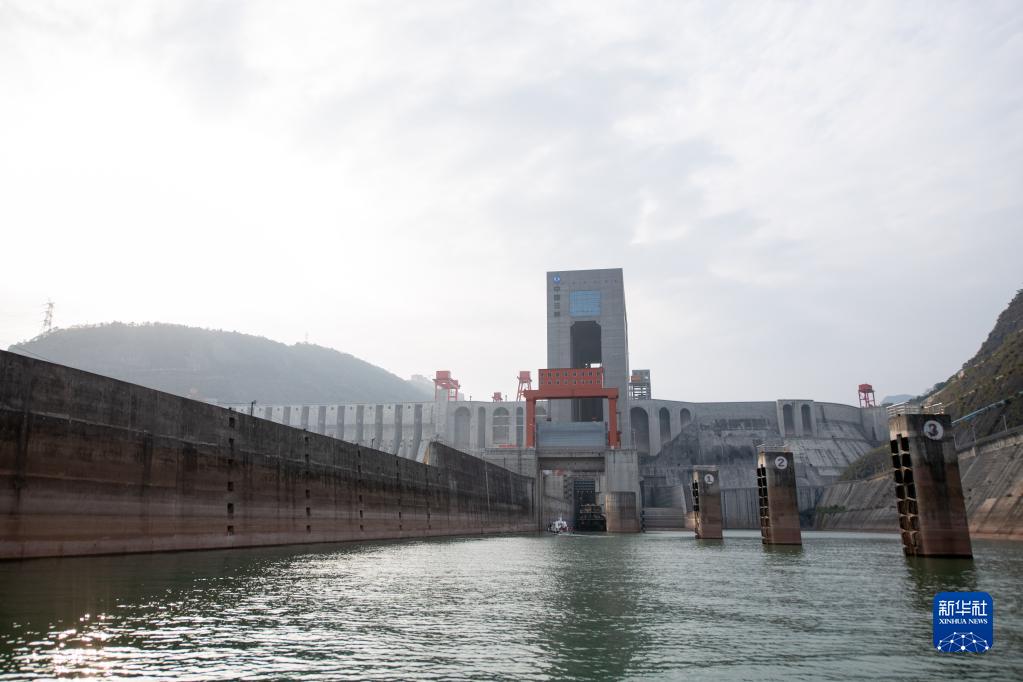 這是11月21日在向家壩水電站拍攝的下游引航道,貨船經此上下升船機翻越向家壩水電站大壩。升船機自2018年5月運行至今,已累計過船13200余艘,通過貨物超530萬噸。