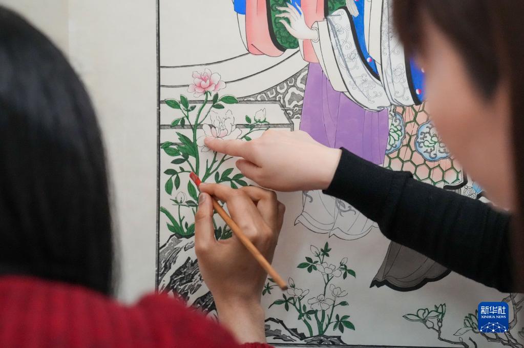 在天津楊柳青木版年畫博物館,天津楊柳青畫社彩繪藝人王艷(右)指導辛格彩繪(11月17日攝)。