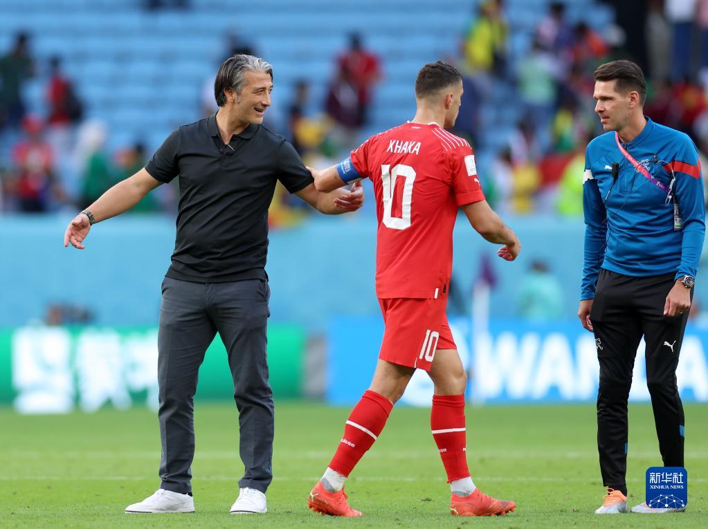 11月24日,瑞士隊(duì)主教練穆拉特·亞金(左)與球員扎卡(中)在比賽后。