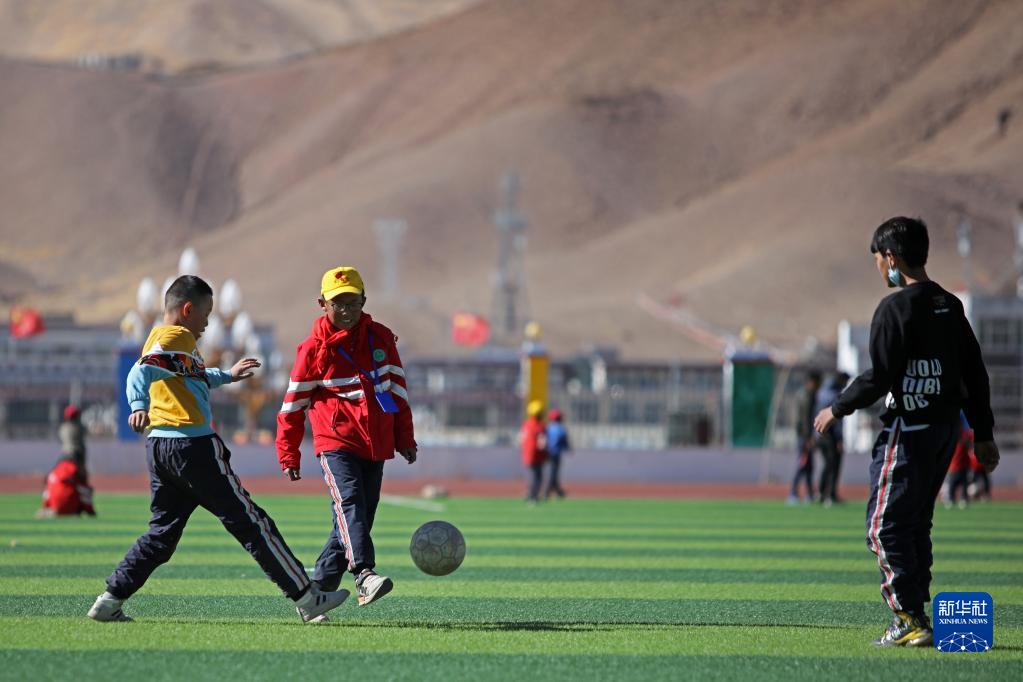 西藏阿里陜西實(shí)驗(yàn)學(xué)校的孩子們在踢足球(4月11日攝)。