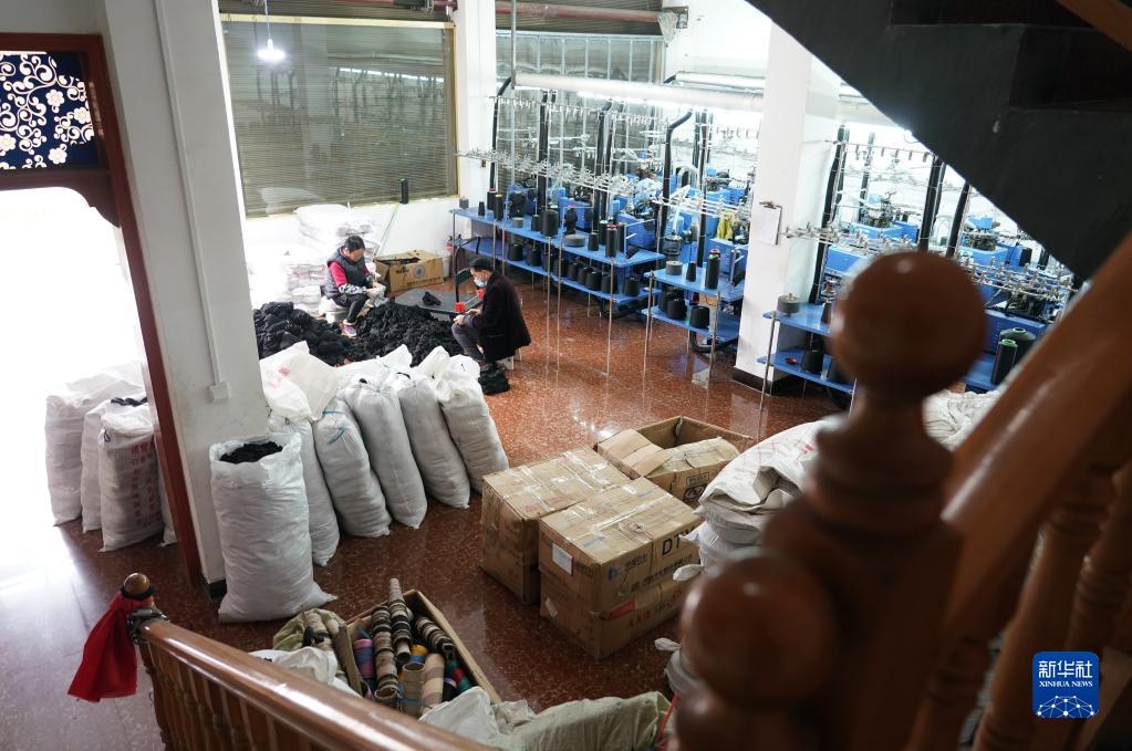 11月23日,陜西安康市紫陽縣紅椿鎮七里溝社區居民郭世清(右)在自家房屋內的“家庭工坊”中織襪。“家庭工坊”由社區織襪合作社提供機器,社區居民提供家中場地和勞力,并獲得計件報酬。