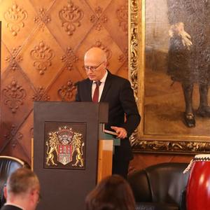 11月23日,在德國漢堡“中國時代”活動研討會上,漢堡市市長彼得·辰切爾發言。