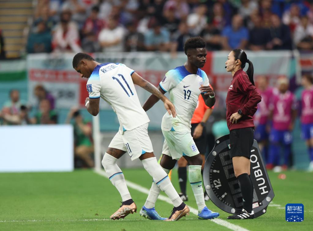 11月25日,英格蘭隊球員拉什福德(左)在比賽中替換隊友薩卡(中)登場。