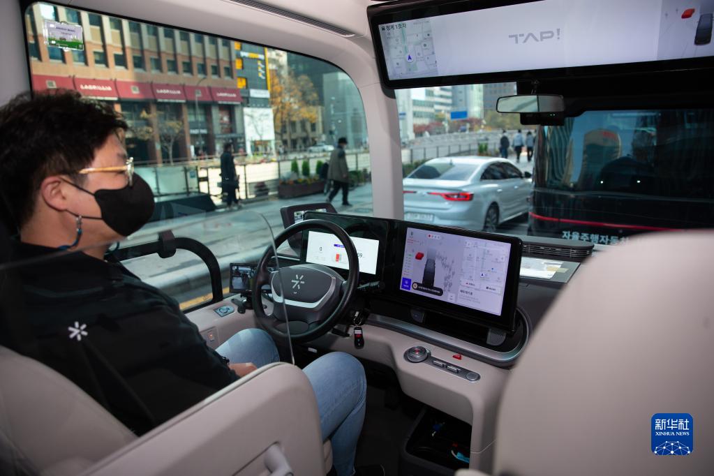 11月24日,在韓國首爾,自動(dòng)駕駛巴士的安全員坐在駕駛室觀看顯示屏。