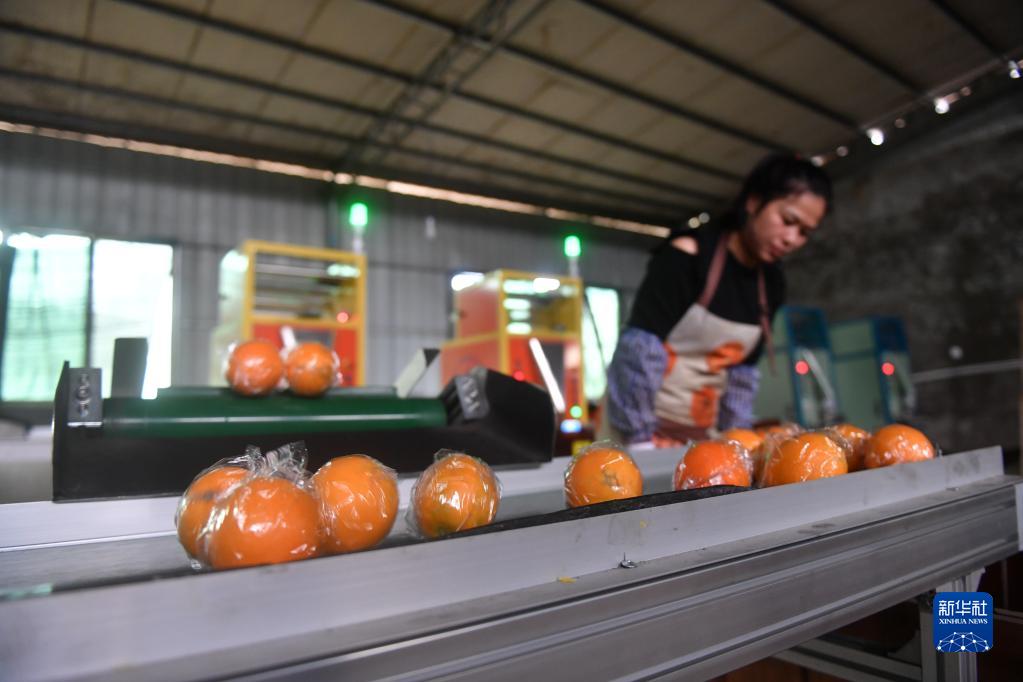 11月26日,在信豐縣安西鎮一家臍橙專業合作社,果農包裝臍橙準備發貨。