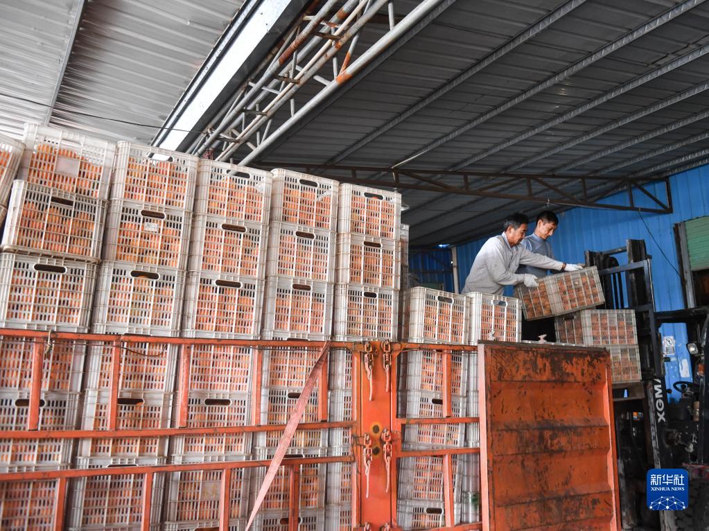 11月26日,在信豐縣安西鎮(zhèn)一家臍橙專業(yè)合作社,果農(nóng)將臍橙裝車。