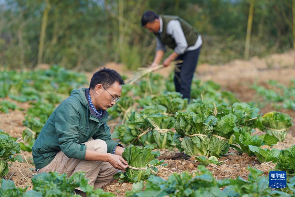 11月24日,鄭濤與父親在蔬菜基地捆扎蔬菜。