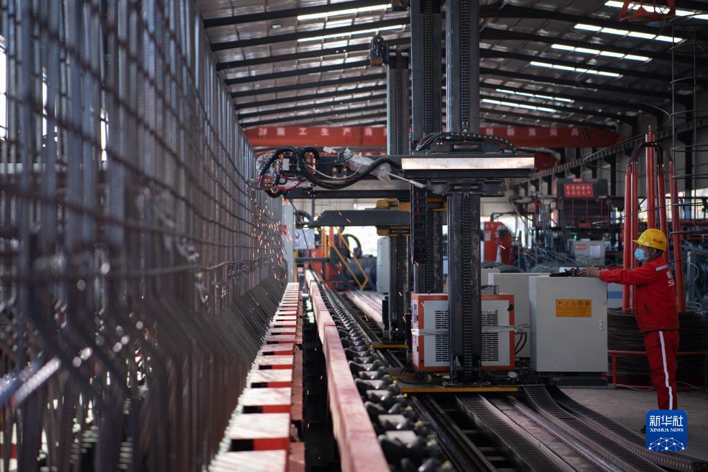 11月25日,在“智慧梁廠”生產線上,工作人員操作機器人焊接。