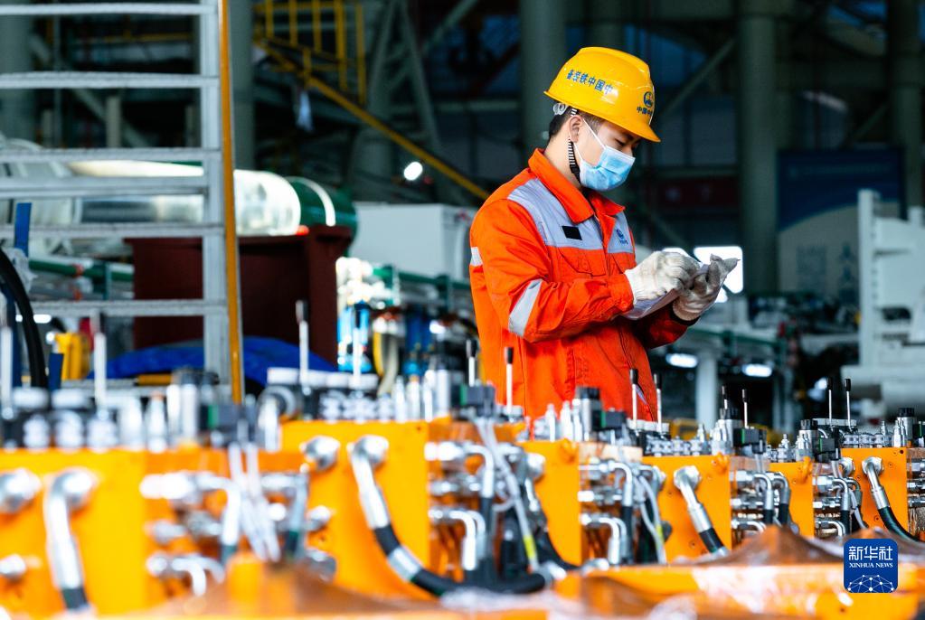 11月24日,工人在中鐵裝備集團車間內檢查自制注漿泵液壓系統安裝情況。