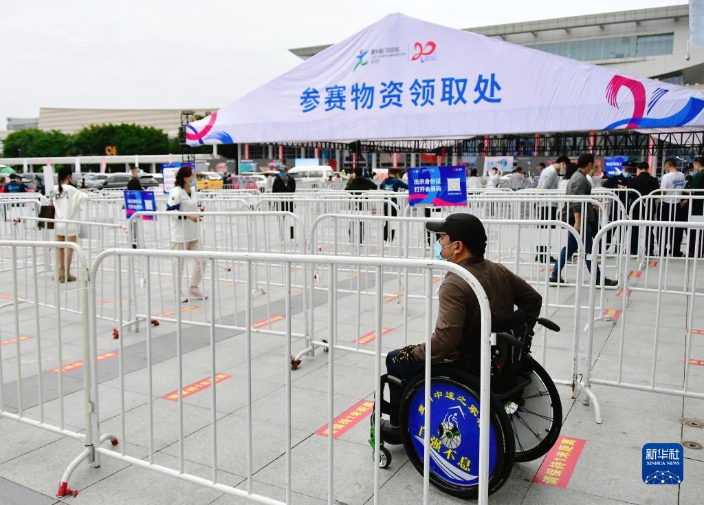 在賽前,謝啟明坐著輪椅領(lǐng)取馬拉松比賽的物資(11月25日攝)。新華社記者 魏培全 攝