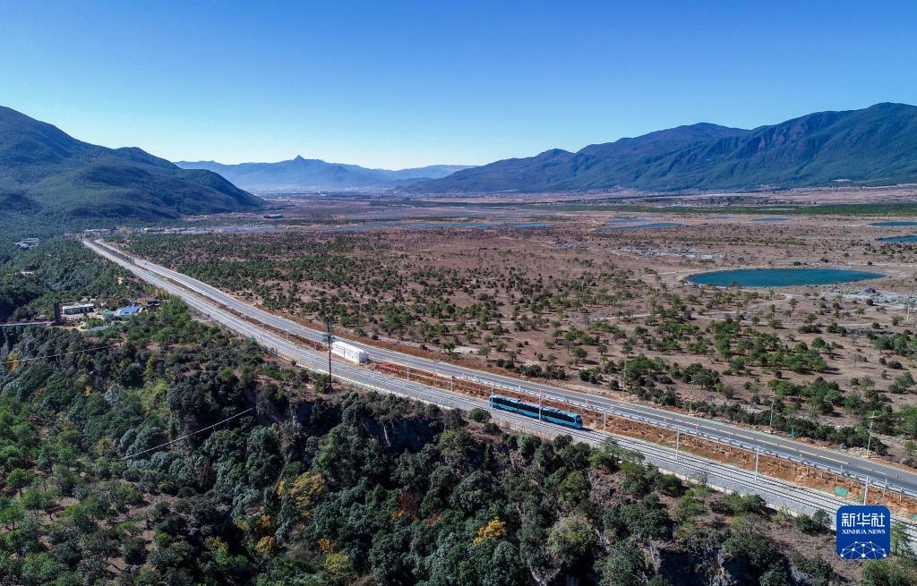 11月28日,觀光火車行駛在麗江觀光火車一期工程鐵路線上(無人機照片)。
