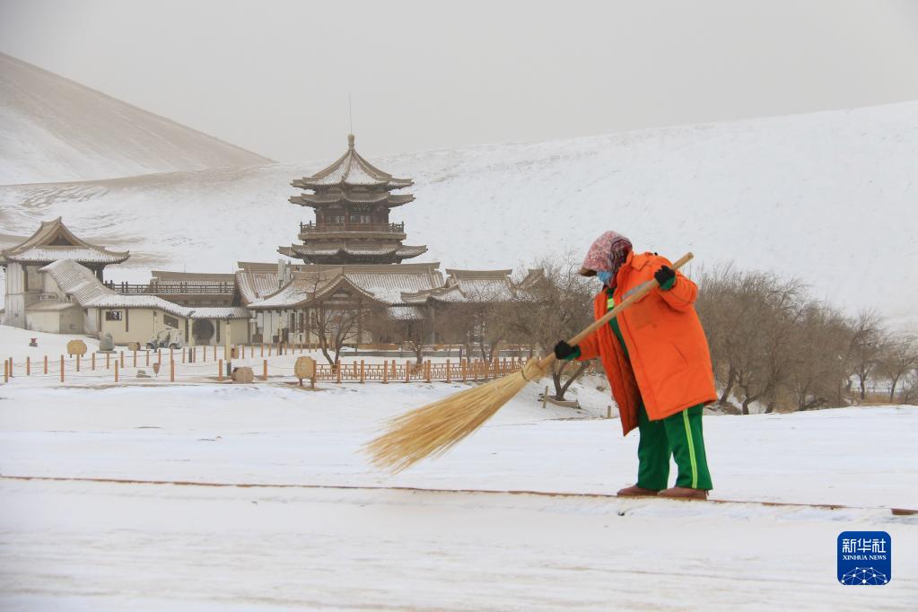 11月28日,保潔人員在甘肅省敦煌市鳴沙山月牙泉景區(qū)清理積雪。