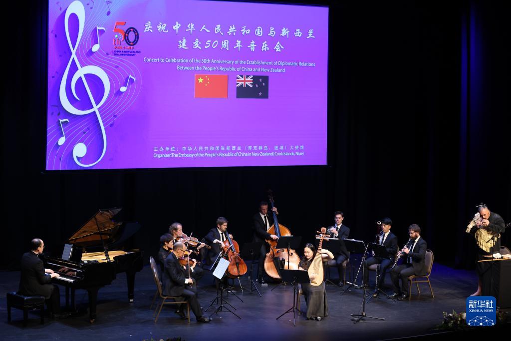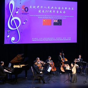 中國駐新西蘭大使館28日晚在新西蘭首都惠靈頓國家博物館舉辦慶祝中新建交50周年招待會和專場音樂會。包括新西蘭外長馬胡塔和前外長布朗利等政要、外國駐新使節、各界友好人士以及華僑華人代表約300人出席。新華社發(孟韜攝)