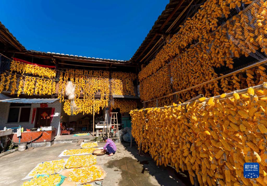 11月29日,漳州市南靖縣梅林鎮梅林村村民在自家小院里晾曬玉米。