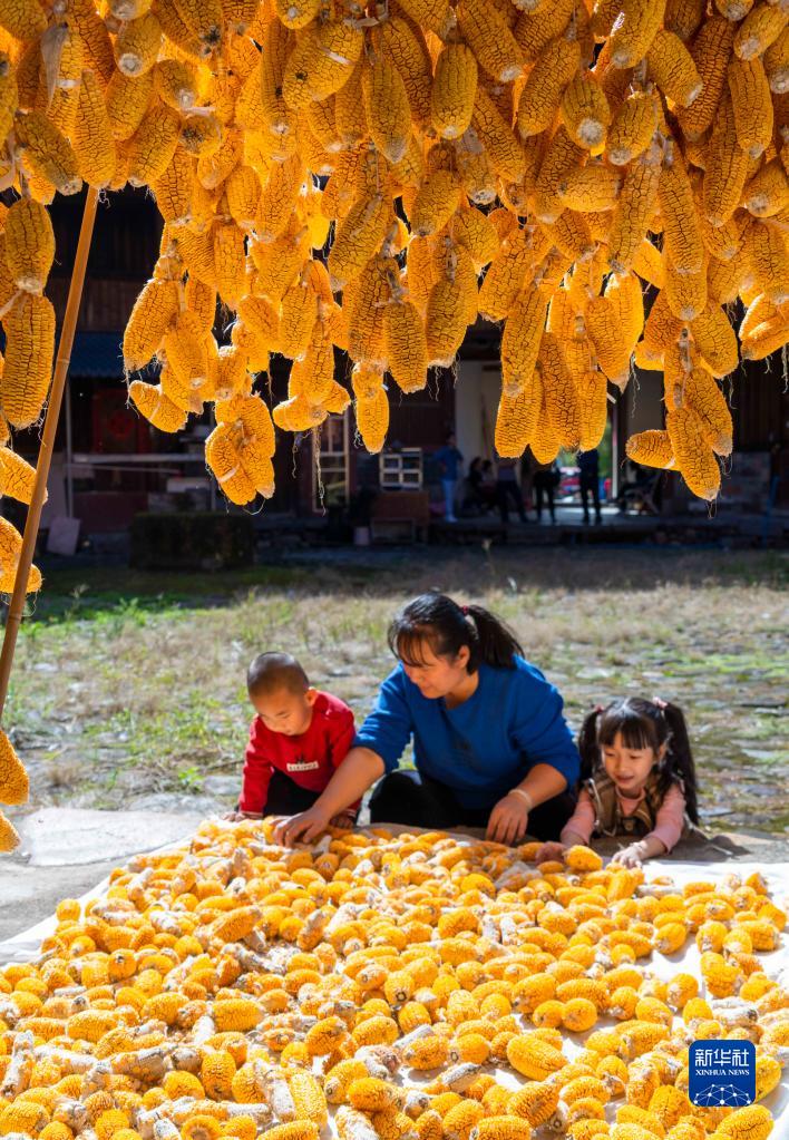 初冬時節,福建省漳州市南靖縣梅林鎮梅林村迎來玉米收獲季,村民們趁著晴好天氣晾曬玉米。近年來,南靖縣梅林鎮發揮地理優勢,大力推廣玉米種植,以產業興旺帶動鄉村振興。