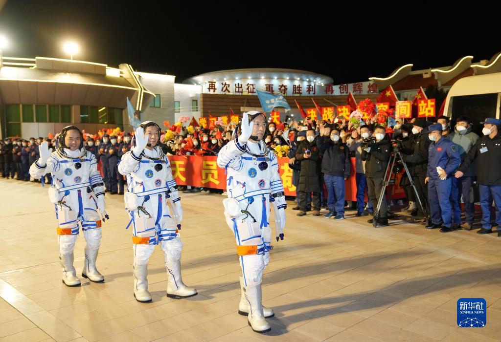 據(jù)中國載人航天工程辦公室消息,11月29日20時18分,神舟十五號載人飛行任務(wù)航天員乘組出征儀式在酒泉衛(wèi)星發(fā)射中心問天閣圓夢園廣場舉行。航天員費俊龍(前)、鄧清明(中)、張陸在出征儀式上。
