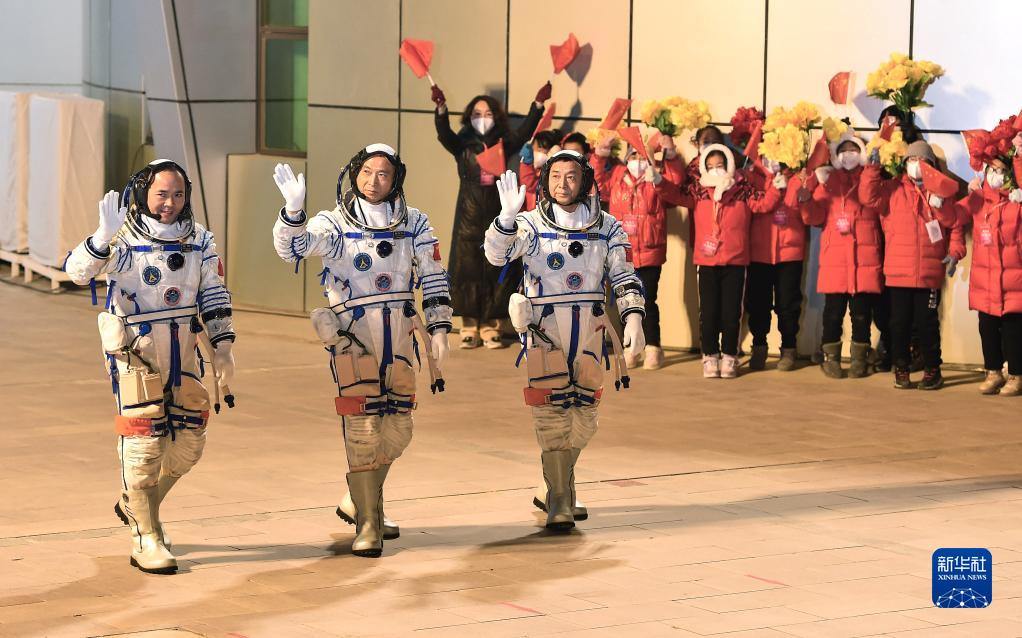 據中國載人航天工程辦公室消息,11月29日20時18分,神舟十五號載人飛行任務航天員乘組出征儀式在酒泉衛星發射中心問天閣圓夢園廣場舉行。航天員費俊龍(中)、鄧清明(右)、張陸在出征儀式上。