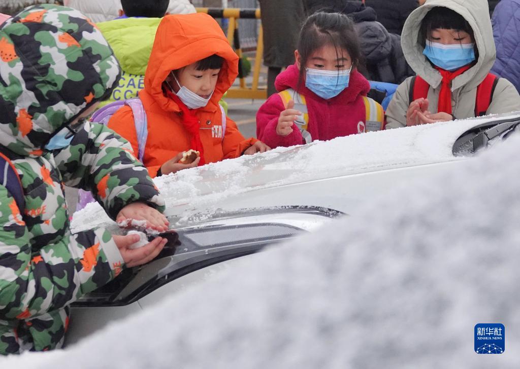 11月29日,小朋友在山東省煙臺市街頭玩雪。