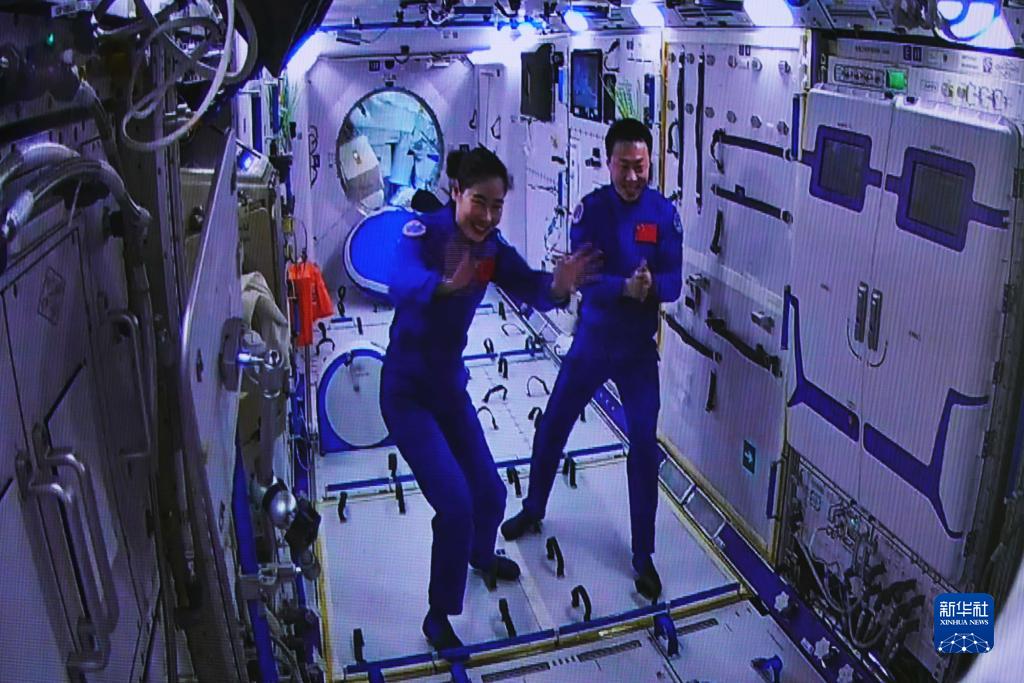 11月30日在酒泉衛星發射中心拍攝的神舟十四號航天員劉洋、蔡旭哲在問天實驗艙迎接神舟十五號航天員乘組的畫面。