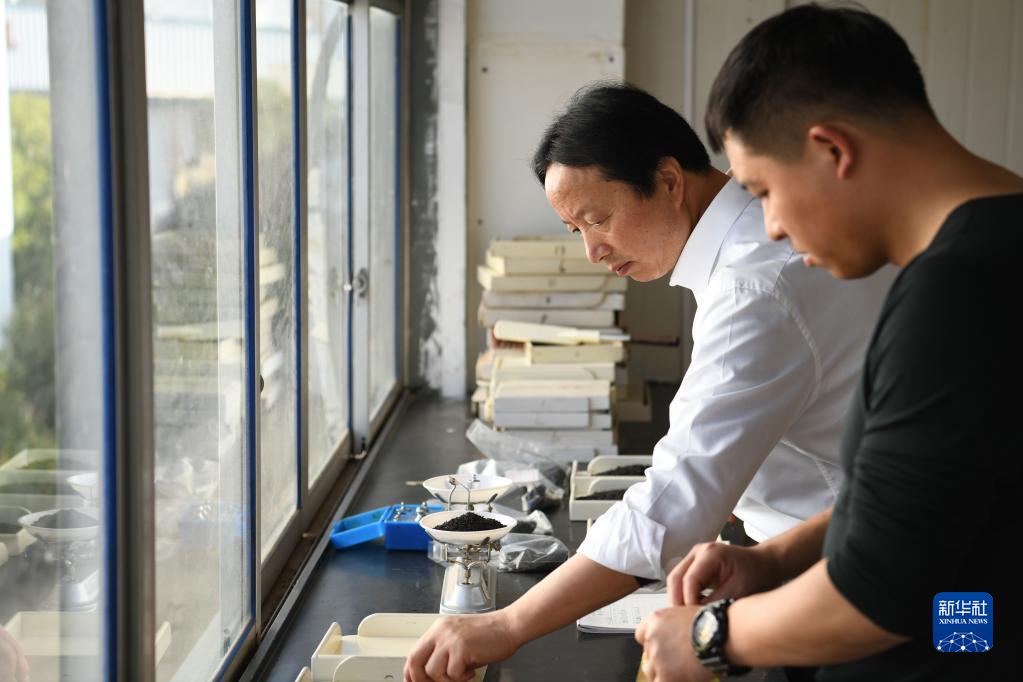 11月26日,安徽祁門紅茶制作技藝代表性傳承人王昶(左)與學生范文翰在祁門紅茶發展有限公司進行祁門紅茶制作的拼配環節。
