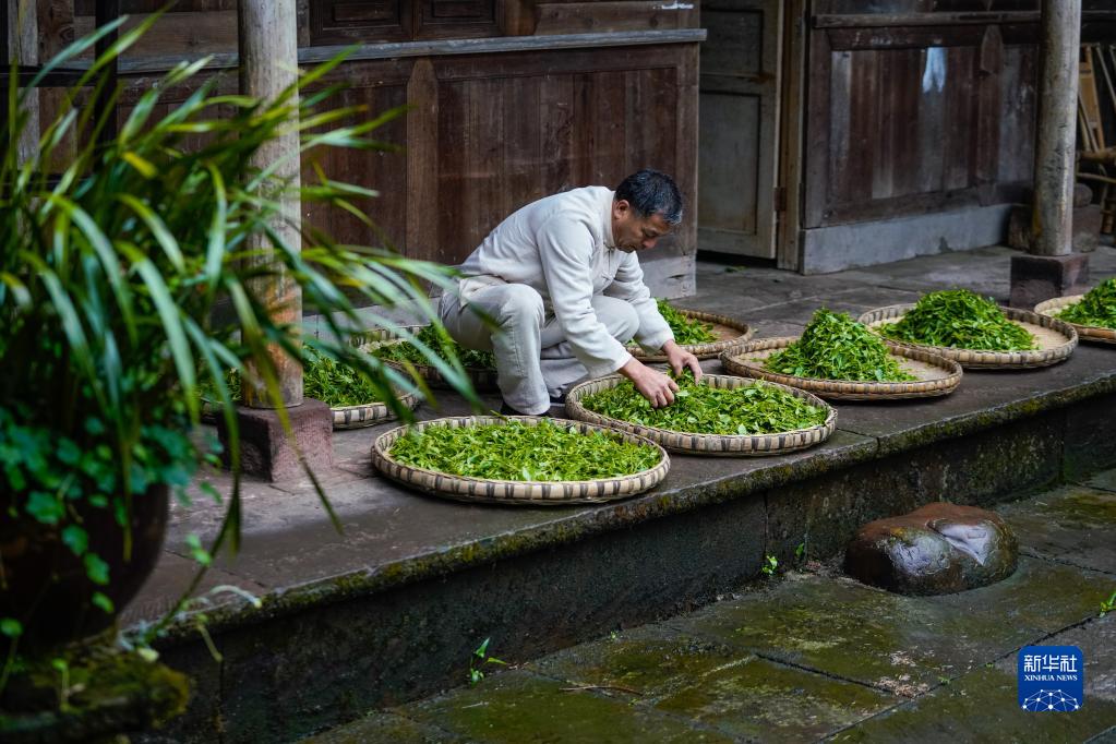 在四川省雅安市名山區的張氏祖屋,張躍華用傳統方式攤晾新采摘的鮮葉(2022年3月31日攝)。蒙山茶產于四川省雅安市名山區境內的蒙頂山,是綠茶的一種。張躍華,生于1959年,是國家級非物質文化遺產代表性項目——綠茶制作技藝(蒙山茶傳統制作技藝)的代表性傳承人。張躍華自幼隨父親學習蒙山茶傳統制作技藝,是“張氏甘露”第五代傳人,他每年都要招收年輕徒弟,希望蒙山茶傳統制作技藝能世世代代傳承下去。