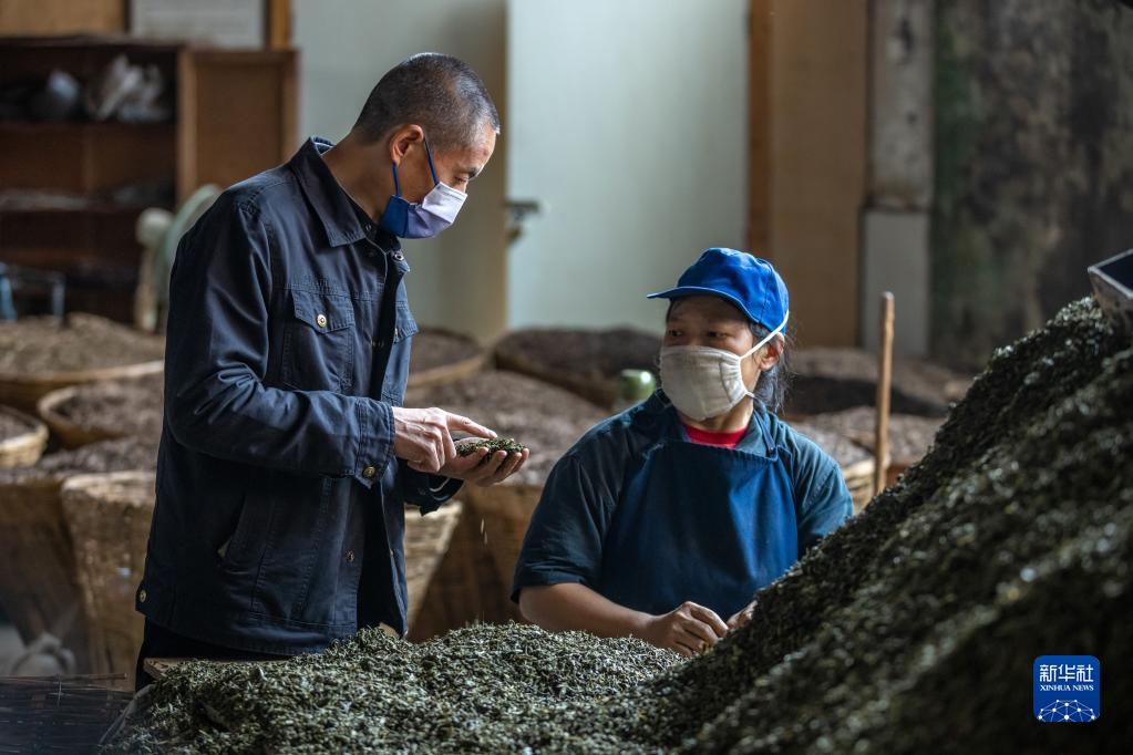 在四川省雅安市友誼茶葉有限公司的生產(chǎn)車(chē)間,甘玉祥(左)指導(dǎo)工人檢查茶的品質(zhì)(2022年11月24日攝)。南路邊茶是黑茶的一種,產(chǎn)于四川省雅安市,又稱(chēng)“邊銷(xiāo)茶”“南邊茶”“藏茶”等。甘玉祥,生于1963年,是國(guó)家級(jí)非物質(zhì)文化遺產(chǎn)代表性項(xiàng)目——黑茶制作技藝(南路邊茶制作技藝)的代表性傳承人。他從小隨父親學(xué)習(xí)制作南路邊茶,希望通過(guò)不懈努力,讓南路邊茶被更多人飲用和喜愛(ài)。