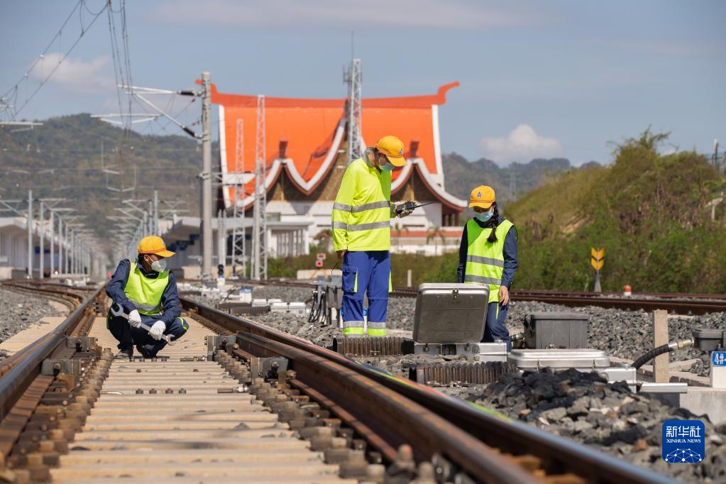 12月1日,在老撾瑯勃拉邦,中老鐵路雙方員工共同維護線路。
