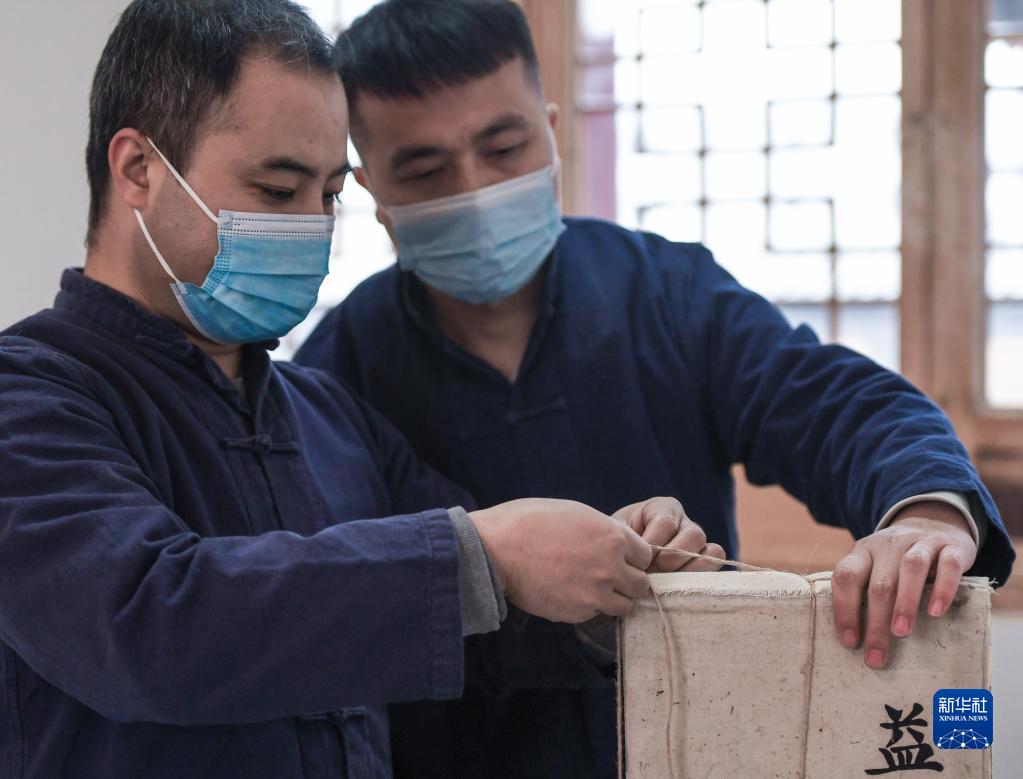 在咸陽“益生源記”仿古茯茶作坊,筑茶師王萌樂(左)、劉林展示捆扎工藝(11月30日攝)。