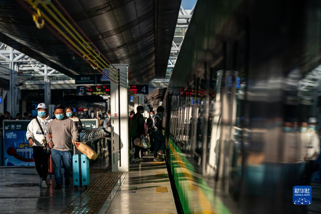 11月23日,旅客在昆明站進站乘坐中老鐵路列車。