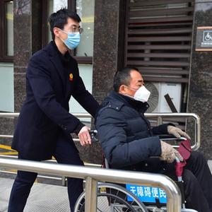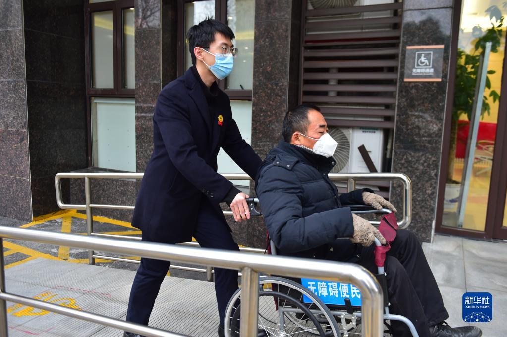 江西省南昌市紅谷灘區(qū)市民中心的工作人員推著市民劉順保通過無障礙通道前往中心大廳(12月2日攝)。