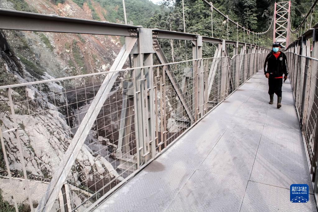 12月5日,在印度尼西亞東爪哇省盧馬姜,一名男子走在被火山灰覆蓋的橋上。