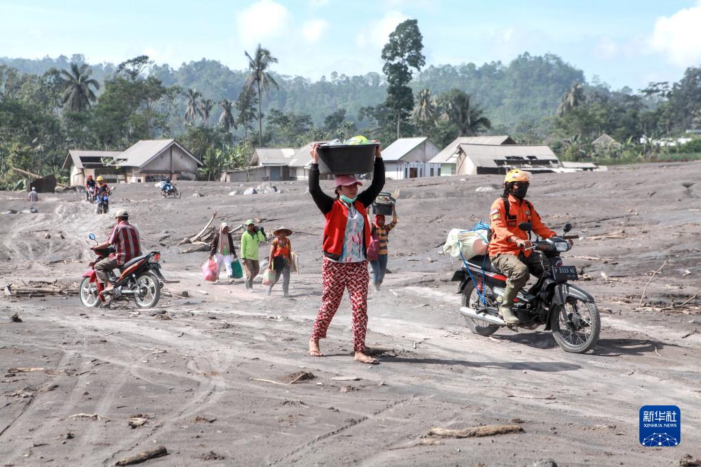 12月6日,在印度尼西亞東爪哇省盧馬姜縣松伯武盧村,人們攜帶物品撤離受火山噴發(fā)影響的區(qū)域。
