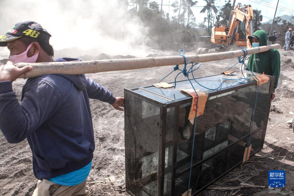 12月6日,在印度尼西亞東爪哇省盧馬姜縣松伯武盧村,人們攜帶物品撤離受火山噴發影響的區域。