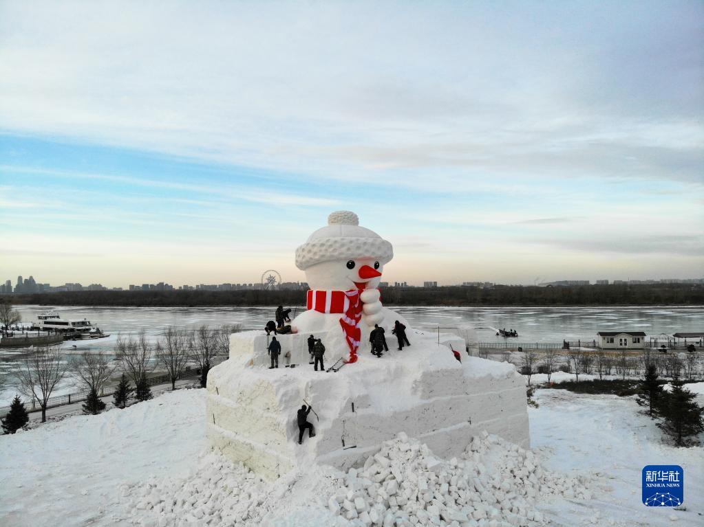 12月6日,工人在松花江哈爾濱段江畔搭建巨型雪人(無人機(jī)照片)。