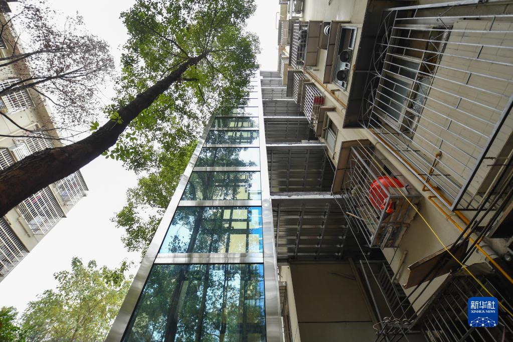 12月7日拍攝的長沙市天心區裕南街街道長坡社區木材廠宿舍一部待完工的外掛式電梯。