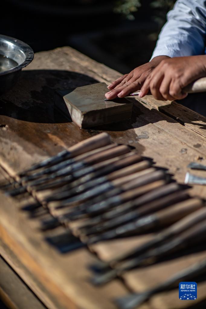 段四興在打磨木雕工具(12月1日攝)。