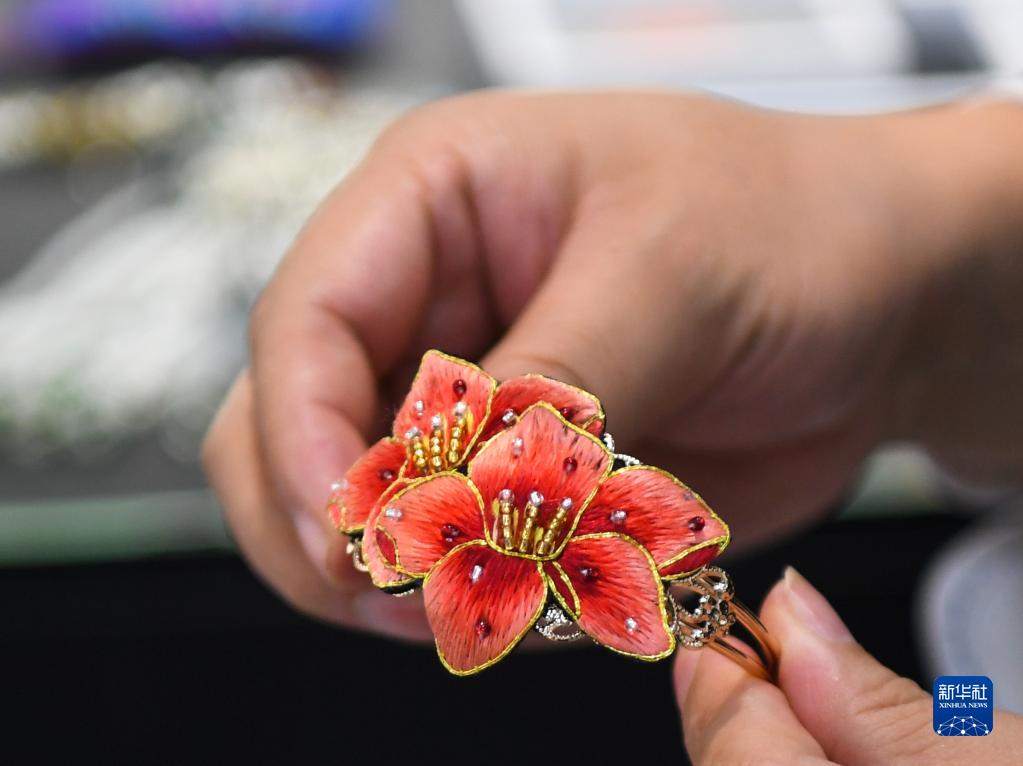 在廣州市荔灣區(qū)的工作室,王新元展示廣繡文創(chuàng)產(chǎn)品(12月6日攝)。