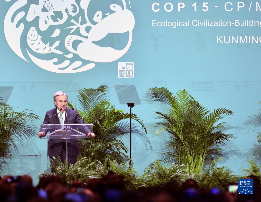 12月6日,在加拿大蒙特利爾,聯(lián)合國秘書長古特雷斯在《生物多樣性公約》第十五次締約方大會(huì)(COP15)第二階段會(huì)議開幕前夕的歡迎儀式上講話。