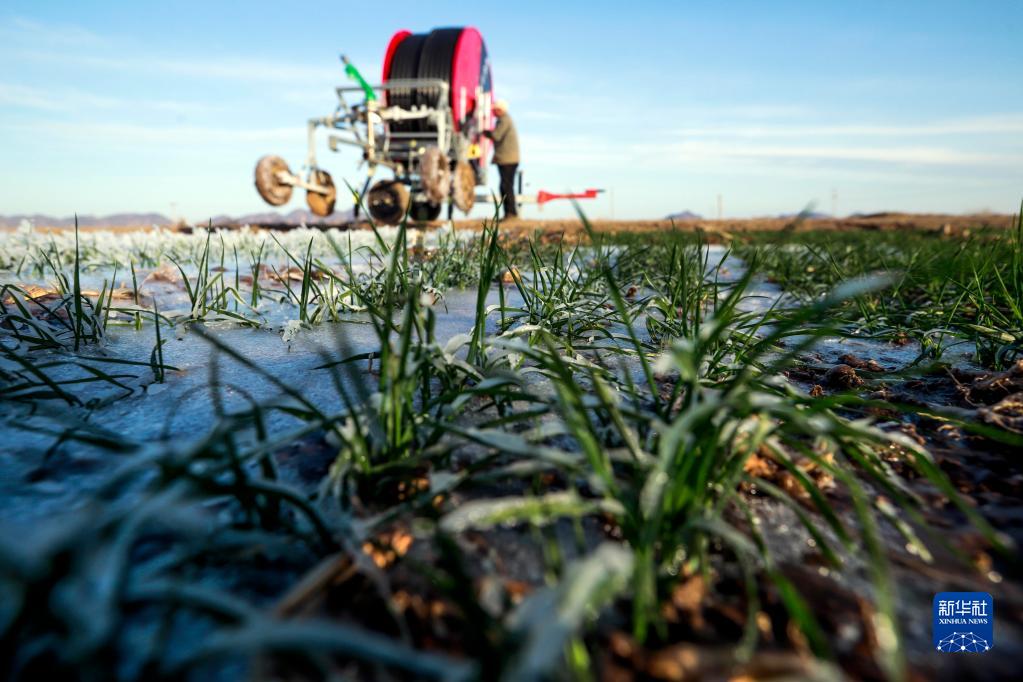 12月7日,河北省遵化市東新莊鎮農民開動噴灌機澆小麥封凍水。