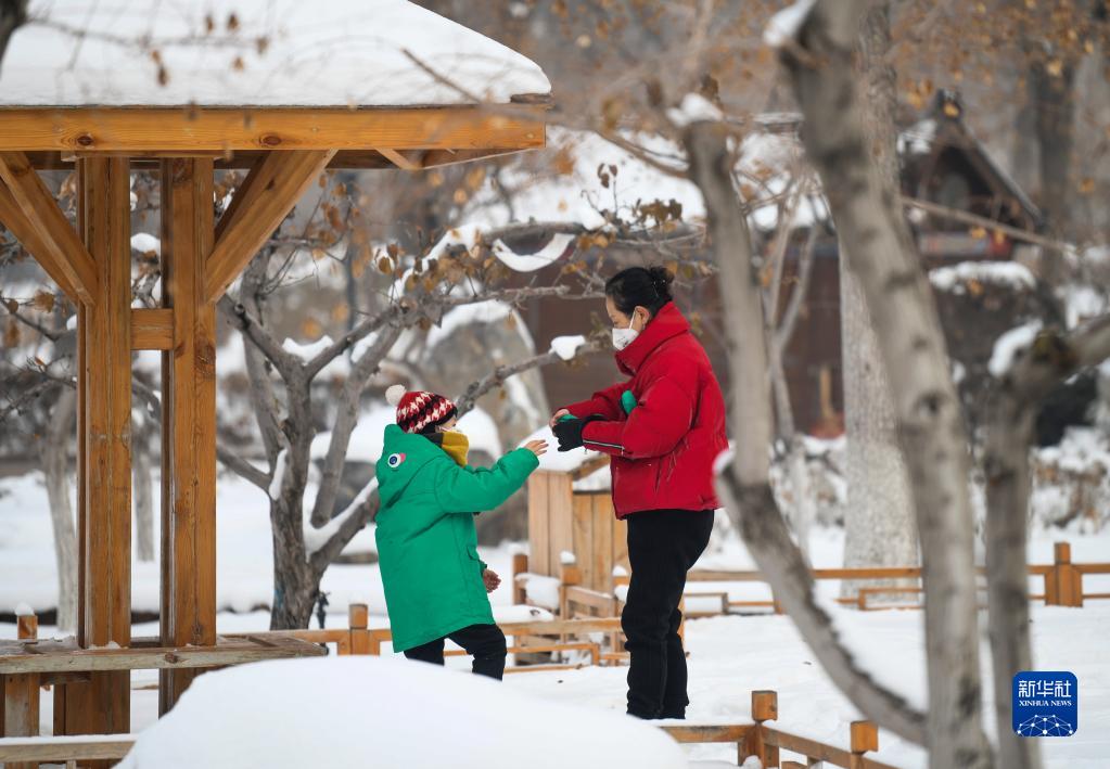 12月7日,在烏魯木齊人民公園內(nèi),一名小朋友和家人在玩耍。