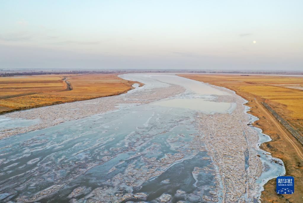 12月7日拍攝的內蒙古鄂爾多斯市達拉特旗冰封黃河景象(無人機照片)。