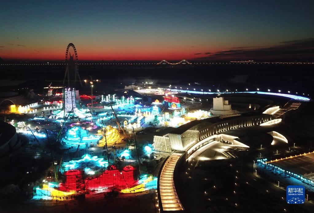 12月7日,施工人員在哈爾濱冰雪大世界園區(qū)施工作業(yè)(無(wú)人機(jī)照片)。
