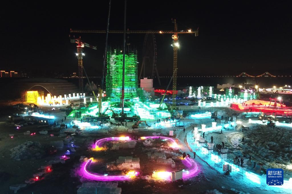 12月7日,施工人員在哈爾濱冰雪大世界園區施工作業(無人機照片)。