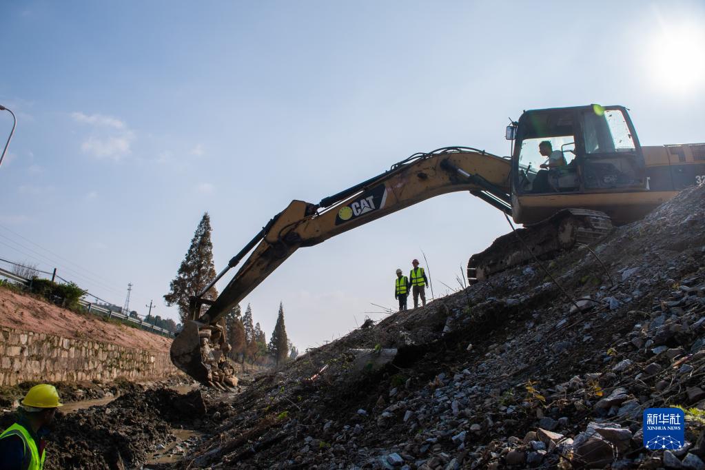12月8日,工作人員在長沙縣金井鎮湘豐村金脫河河道提質改造項目建設現場施工。