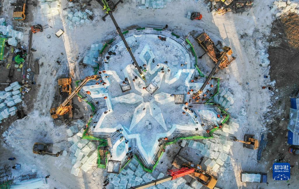 12月8日拍攝的哈爾濱冰雪大世界園區(qū)冰建項目施工現(xiàn)場(無人機照片)。