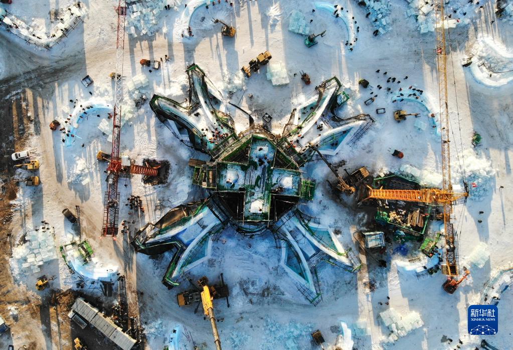 12月8日拍攝的哈爾濱冰雪大世界園區冰建項目施工現場(無人機照片)。