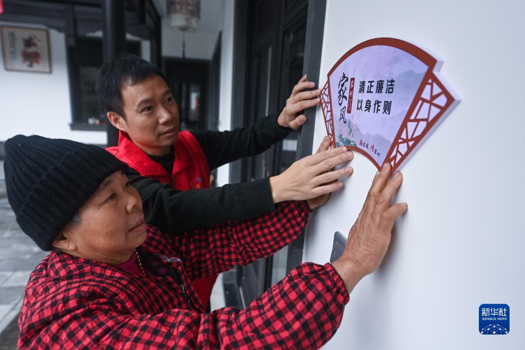 12月9日,在杭州市臨安區(qū)太陽(yáng)鎮(zhèn)上莊村,黨員志愿者和村民一起把清廉家風(fēng)的宣傳牌掛在墻上。