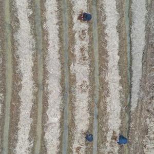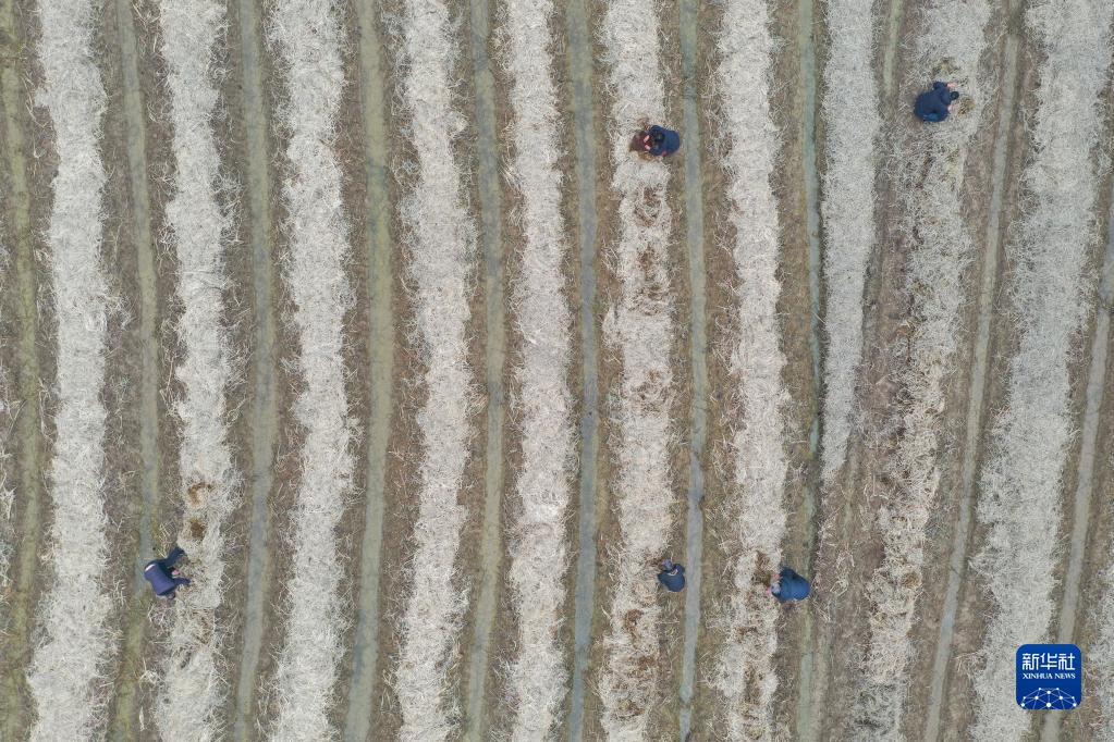 在江西省南昌市南昌縣幽蘭鎮,村民們在收割后的晚稻田里利用處理過的秸稈種植大球蓋菇(12月7日攝,無人機照片)。